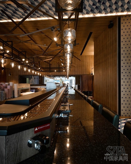 我們將這個(gè)店面想象為大海上一艘燈火通明的漁船,它有自己的航道、不曾迷失,那個(gè)引導(dǎo)返港的方向,就是海壽司的初心:用和諧簡(jiǎn)約的調(diào)理,去尊重、品味、珍惜來(lái)自土地與海洋恩賜的食材。這個(gè)故事的主角、也是店內(nèi)的靈魂所在,回轉(zhuǎn)臺(tái),是那艘海上夜捕的漁船,燈火通明、勇往直前、充滿生命力。我們刻意選擇了類似油燈造型的吊燈,用序列的方式凸顯數(shù)量,讓空間被吧臺(tái)上的吊燈布滿,配合噴黑鐵架與鐵網(wǎng),完整呈現(xiàn)古樸的美感。食客置身其中,抬眼看見(jiàn)的每一個(gè)面向,都是海壽司的浮世繪,不僅有層次,還有故事的想象延伸。