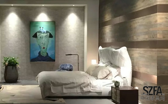 幽默的當(dāng)代畫(huà)作和Francois Van Reenen 的呆呆金狗彼此呼應(yīng),再次突顯出布局的自由和童趣,連床邊毛茸茸的藍(lán)色單椅都被邱德光視為是小狗的延伸想象,非常有趣。