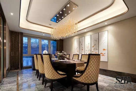 設(shè)計師在軟裝設(shè)計上,取“魚、水”為題,“魚”與“玉”為諧音,“水”則養(yǎng)“玉”呼應(yīng)主題。深褐色調(diào)為主的色彩,中式傳統(tǒng)家具與知名品牌家私,強(qiáng)調(diào)細(xì)致與高貴。