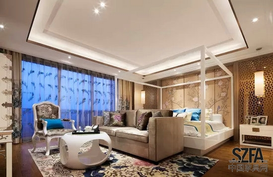 臥室則以清雅做基調(diào),運(yùn)用了花的顏色與鳥的圖案。這是古人喜愛的祥和圖案,是一種婉轉(zhuǎn)的向往,設(shè)計師借用美好的愿景添置在臥室內(nèi),令東方文化無處存在。