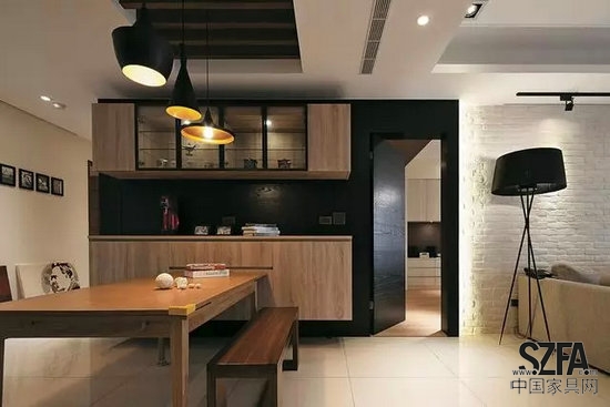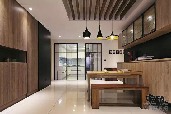 餐廳設(shè)計(jì)的非常簡約現(xiàn)代化,暖黃色的燈管打落在深色木質(zhì)的餐桌上,氣氛非常溫馨而不落俗套。