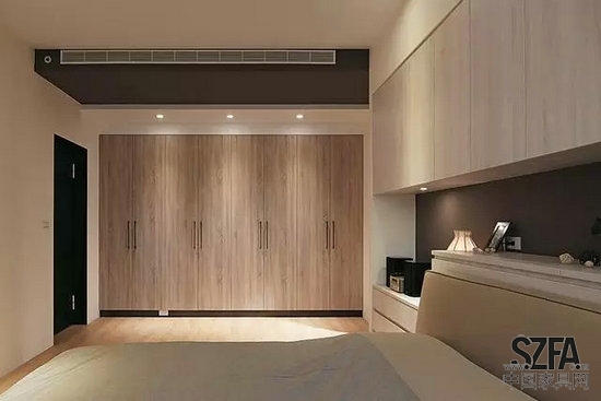 簡單中帶有一絲奢華,墻壁內(nèi)嵌的木質(zhì)衣柜實(shí)用又有美觀。