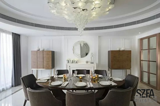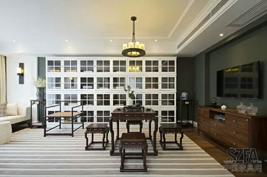 室內(nèi)大部分的家具選擇簡(jiǎn)潔新古典款式,用美國(guó)黑胡桃實(shí)木及酸枝木皮制作,點(diǎn)綴了珍貴大紅酸枝明式家具,如案幾、南宮椅、禪椅及茶桌,少量點(diǎn)綴的中式家具給室內(nèi)帶來(lái)淡淡的人文氣息。