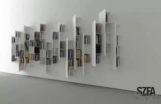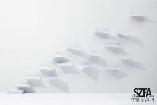 萬萬沒想到,這些輕揚的紙是一張張A4大小的薄鋼板,通過模具彎曲壓制而成的墻壁擱架。這“紙“有五種形態(tài),交錯著掛在墻面上頗有一些寫意的感覺。