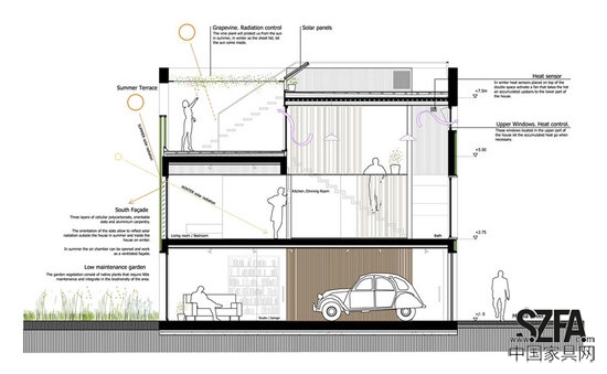 兩個主要的立面擁有三層圍護。它們就像一個過濾器來調節(jié)內(nèi)部的光線、溫度和舒適的環(huán)境。最外層是4cm的聚碳酸酯,內(nèi)層是雙層玻璃,可活動的鋁制百葉窗位于這兩層之間,我們有可能根據(jù)通風要求打開或關閉位于南向的聚碳酸酯和玻璃之間的夾層:在冬季的時候,夾層會保持關閉狀態(tài),百葉窗將轉向內(nèi)部以便得到更多的光照。在夏季的時候,夾層將保持打開,百葉窗將轉向外部,如此可以避免室內(nèi)遭受陽光直射。如果需要,也可以完全打開內(nèi)層的玻璃讓整個空間從南到北產(chǎn)生對流通風。房子的設計利用基本的技術得到最舒適的環(huán)境。我們只用了3個通風設備:一個通風灶臺,一個風機系統(tǒng)和一個管道恒溫器,將積累在兩倍高度的熱空氣帶到較低的空間,并利用熱泵作為一個額外的支持。
