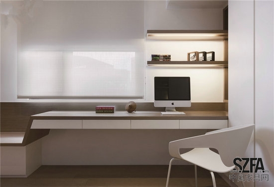 設計團隊為這間單元住宅的中央打造出一處富有“茶藝”氛圍的品茶區(qū),極具藝術(shù)感,在這里,居住者可以一邊品茶,一邊欣賞室內(nèi)各空間的裝潢景致,同時,也為觀賞未來的公園綠化景致提供了最為理想的視角;此外,它也實現(xiàn)了室內(nèi)與戶外視覺的自然過渡,是宅內(nèi)一處適合于放松、社交、互動和休息的區(qū)域。品茶區(qū)空間以木質(zhì)材料裝潢,其藝術(shù)視覺觀感強于宅內(nèi)的其他各處,同時也賦予這間現(xiàn)代單元住宅以些許寧謐的自然之感。同樣質(zhì)地的木材紋路還被用于壁紙的裝飾中,而染色玻璃墻體和相應的軟質(zhì)材料則都有著良好的光滑度,以保持室內(nèi)裝飾紋理的視覺平衡。