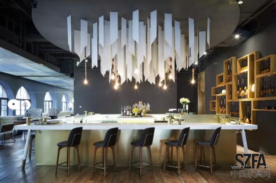 吧臺區(qū)域選擇亞洲傳統(tǒng)書法元素來點(diǎn)題。宣紙被裁剪成一條條斜邊紙條,從木制天頂優(yōu)美地垂落,幾條木吊燈配合氣場十足的黃銅吧臺桌,縱向?qū)用媪Ⅲw豐富。