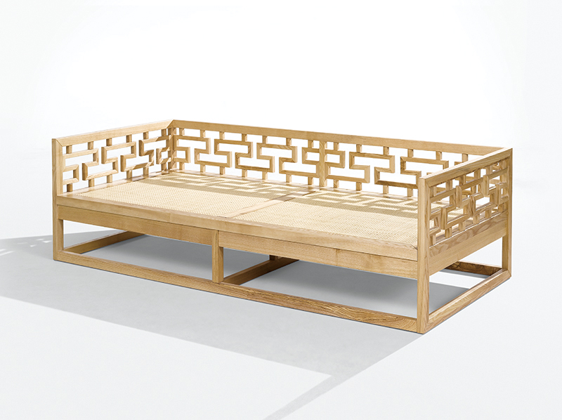 材料為橡木著色、淺麻布印紋,竹面編織。