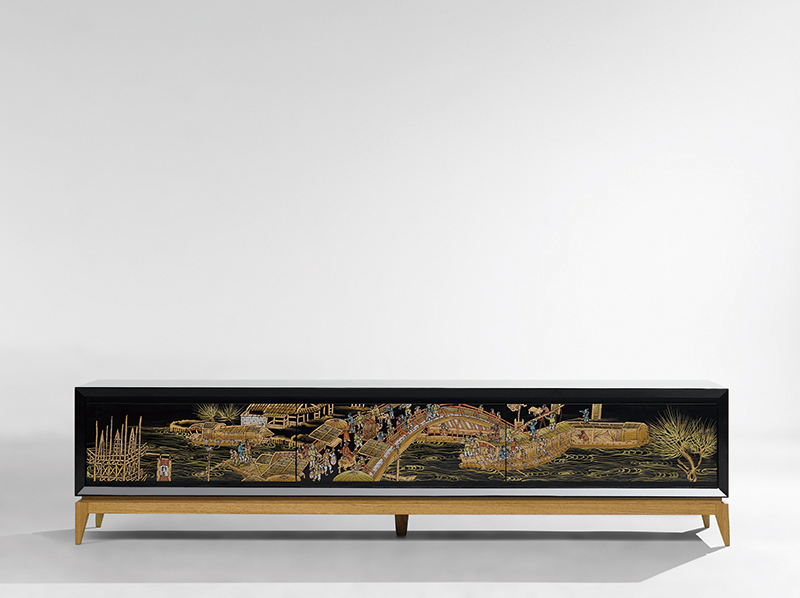 清明上河圖邊柜,是物本造2014年最新系列“Neweast Artdeco”之一。作品選用清明上河圖的局部畫面作為柜子的主題,配以現(xiàn)代形體,加上黑色鋼琴漆讓整個(gè)作品時(shí)尚中透著中國特色;淺色的貝殼流蘇既強(qiáng)化了主題風(fēng)格又為點(diǎn)睛之筆,北美橡木腳在整體中起到了既反差又呼應(yīng)的作用,同時(shí)也提升了作品在材料上的質(zhì)感。