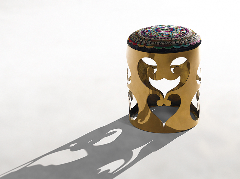 將傳統(tǒng)的元素以現(xiàn)代手法應(yīng)用而設(shè)計(jì)的一款凳子,如意的圖案鏤空以鈦金的材料制作,時(shí)尚中透著韻味;精繡的坐墊,圖案華麗而優(yōu)美,極具現(xiàn)代民族風(fēng)。