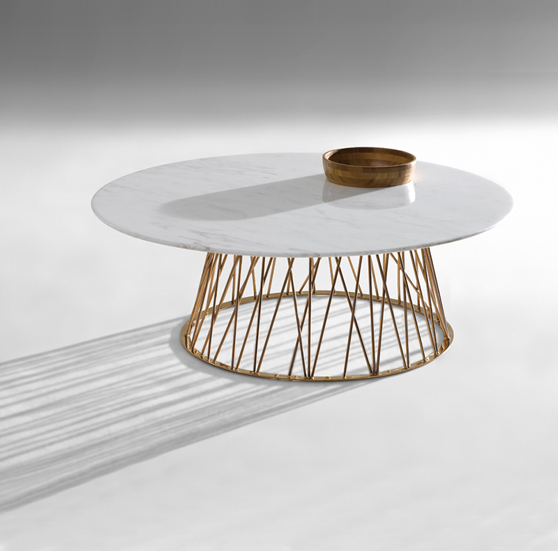 圓型的白色大理石臺(tái)面似一輪圓月,結(jié)合下部的鈦金不規(guī)則條,光影下似竹影一般同圓臺(tái)面相得益彰產(chǎn)生了無限的意境與遐想。一個(gè)竹制的碗,可作水果盤鑲嵌在臺(tái)面上,為點(diǎn)睛之筆,既方便使用又極具構(gòu)成的美感。