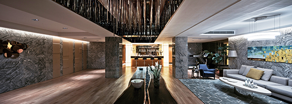 優(yōu)閑和娛樂功能座落在負一二層,具備更佳的隔音效果。中庭泳池區(qū)底部兩層高中空上方掛有銅管LED,為這派對空間呈現(xiàn)出星光燦爛的宴會氣氛,再度繪出了大自然的景致之美,賓主在浪漫的氣息中進行閱讀,品嘗美酒,觀看影劇和修身健體渡過歡樂時光。