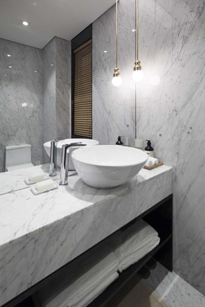 衛(wèi)生間沿用了客餐廳的大面石材,使空間更為統(tǒng)一。淋浴間和馬桶間分為兩個空間。為了提高空間利用率,淋浴間的門設計成石材暗門,從外面看與玄關區(qū)域融為一體,美觀又實用。