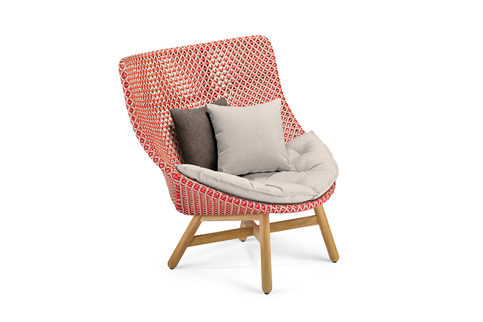 Conceived by one of Europe’s most talked-about young design talents, Sebastian Herkner of Germany, MBRACE fully lives up to the welcoming gesture invoked by its name. One experiences a warm, secure, cocooning feeling when being embraced by the chair’s extra-wide back, especially after a cool dip in the pool. Herkner designed the seat to be invitingly comfortable even late in the season, after MBRACE’s luxurious seat cushions have been stored away.
