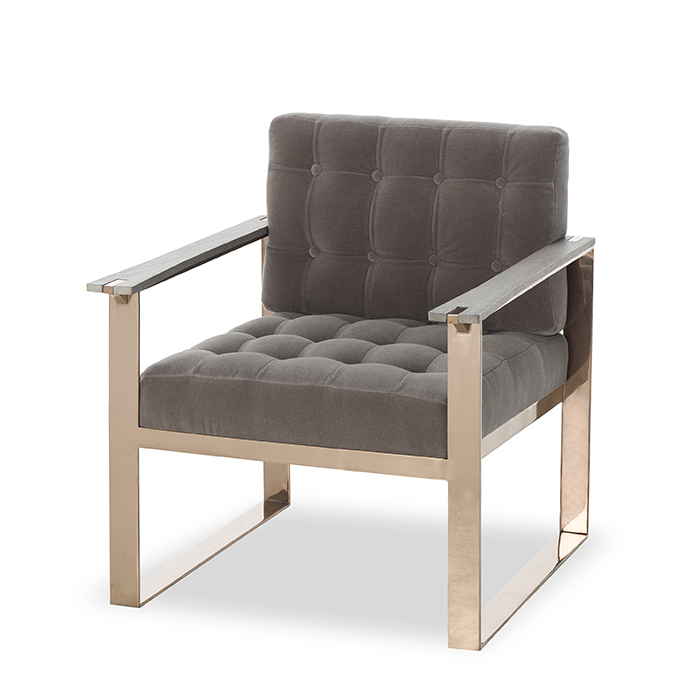 Featured metal finishes include rose gold, nickel, bronze, brass and stainless steel with smoked glass, wood and coloured lacquers to create a high fashion point of view which pervades the whole collection. The Vinci chair, with its rose gold metal frame and wood arms, exudes a sense of refined luxury, balancing strong, clean lines with organic textures.