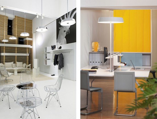 The ARBA family of lamps is equipped with high-quality (DALI) electronics und energy-saving fluorescent lights of constant flux, with excellent color projection and long operating life. The standing and table lamps have a switch in the cable while the hanging lamp may have a dimmer or an off/off switch as the customer requires when installing. The large hanging lamp is 600 mm in diameter and has four powerful 42 W luminaires and, with their powerful light, can be used in offices, public buildings and places with high ceilings.These designed by Matteo Thun & Antonio Rodriguez.