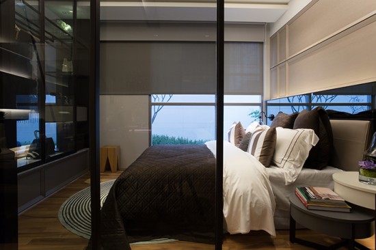 靠墻的衣柜背墻具有穿透性的強(qiáng)化玻璃,隔而不分兩個空間,房間頓時放大且明亮;而在需要隱私的時候,再利用可以隔絕視覺的卷簾或百頁來分隔,空間的利用性就可以大大的增加,而衣柜本身的深度和前后面板雙層強(qiáng)化玻璃的隔音,在實(shí)用性上達(dá)到加成效果,這就是設(shè)計師在每一個空間交界中想要探討的議題模式:是不是能讓每個平面的交界墻面,都能夠達(dá)到最高利用率。