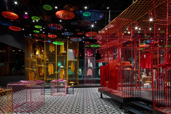 潮女區(qū)大色塊的撞色,由一根根鐵藝曲折而成的彩色貨架,在這個(gè)強(qiáng)調(diào)個(gè)性的空間,利用衣架的前后折度來(lái)分割成雙面掛衣的結(jié)構(gòu),彩色與折線的拼織來(lái)打造幻彩個(gè)性的空間以呼應(yīng)該空間里服裝展現(xiàn)的個(gè)性。設(shè)計(jì)師整合了女裝品牌四大類型服裝背后的社會(huì)與文化含義通過(guò)四個(gè)空間的不同的設(shè)計(jì)手法來(lái)演繹了女裝背后的穿衣哲學(xué)并且通過(guò)多種陳列的可能性創(chuàng)造了全新的購(gòu)買體驗(yàn)感。