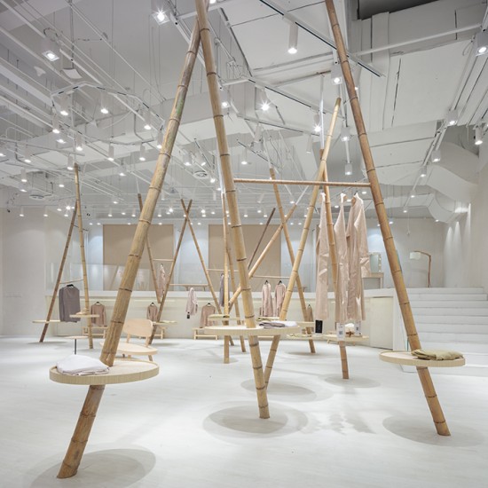 過(guò)主入口區(qū)大大的門拱,進(jìn)入到森女區(qū)。乳白色肌理墻面,白色地面,一個(gè)潔白干凈的空間,支立著一根根竹竿并以麻繩做連接,而衣架也就此成型。穿衣鏡則隱藏在兩根竹竿的夾角立面上??臻g明亮簡(jiǎn)潔并用古樸的材料來(lái)呼應(yīng)該空間衣服類型的氣質(zhì)。