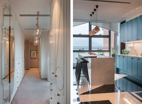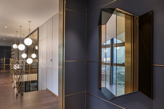 在設(shè)計(jì)的同時(shí),我們也非常注重于周?chē)h(huán)境的相互協(xié)調(diào)。坐落于高樓頂層的復(fù)式雅居,脫離著城市應(yīng)幽的喧囂繁雜,反之獲得的是如同擺脫塵世的安然自得,低調(diào)卻又不失華麗的生活色彩。Thomas  Dariel希望能夠講這一種生活理念通過(guò)設(shè)計(jì)來(lái)傳遞??臻g中反復(fù)出現(xiàn)的幾何線條,高雅深邃的藍(lán)色及綠色宛如窗外景色一般,青山,藍(lán)天。相互輝映。這些存在于空間中的點(diǎn)滴細(xì)節(jié),無(wú)一不訴說(shuō)著一種沉靜,一種雅致。