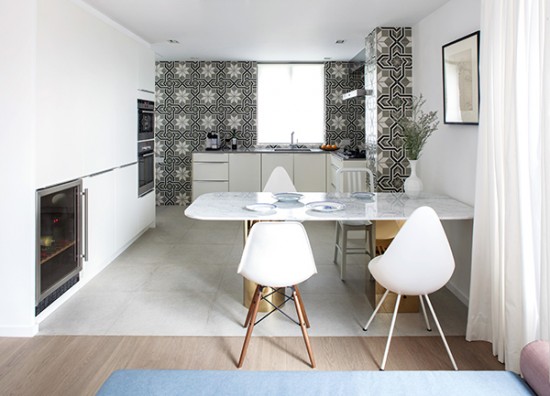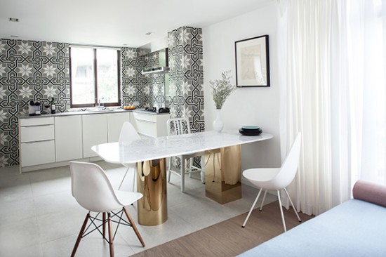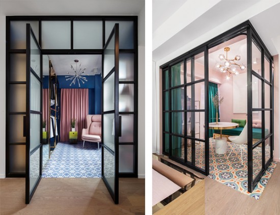 The aesthetic is clean, fresh, and sophisticated. Though evocative of a loft’s spatial continuity, Lim + Lu aimed to avoid any association with the now ubiquitous New York industrial style. Moving away from the ubiquity of industrial-"chic", the pair deliberately chose hues that would inject fresh life into the space. The walls of the living room and bedroom are painted white with black accents, signaling spaces of rest and relaxation. Meanwhile, the kitchen, study, walk-in closet and master bathroom are host to rich pastels and dark jeweled tones, tastefully combined with patterned ceramic tiles to juxtapose the core living space with the extensions. The thresholds created by the subtle distinctions of color, texture and material maintain a fluidity to allow the space to blend effortlessly together as one.