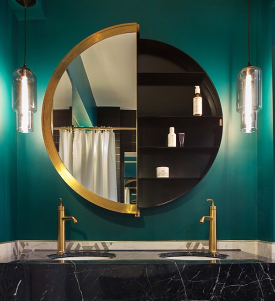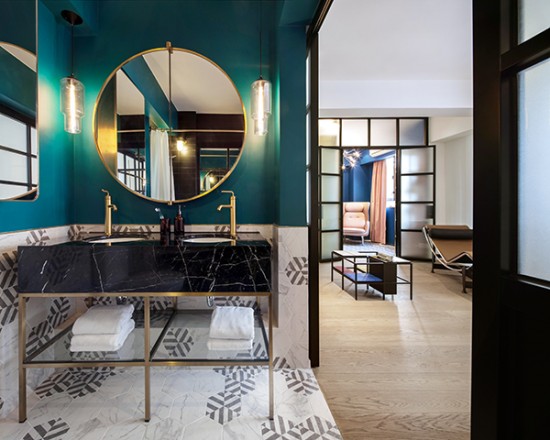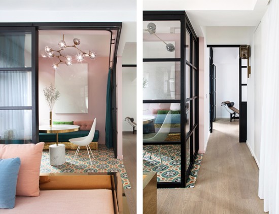 該公寓的設(shè)計美感干凈,清新且精致。盡管會讓人聯(lián)想到閣樓的空間連續(xù)性,Lim+Lu旨在避免與現(xiàn)時泛濫的紐約工業(yè)風(fēng)有任何關(guān)聯(lián)。為擺脫無處不在的工業(yè)“時髦”,設(shè)計師刻意地選擇了可以給空間注入新生命的色調(diào)??蛷d和臥室的墻壁采用白色搭配黑色,劃分出休息和放松的空間。同時,廚房、書房、步入式衣帽間和主臥使用豐富的粉彩和深寶石色調(diào),與圖案瓷磚雅致搭配,使得核心居住空間與延伸空間融為一體。由區(qū)別細(xì)微的顏色、質(zhì)感和材料構(gòu)成的門坎保持了空間的流動性,使得空間毫不費(fèi)力地融合成一個整體。