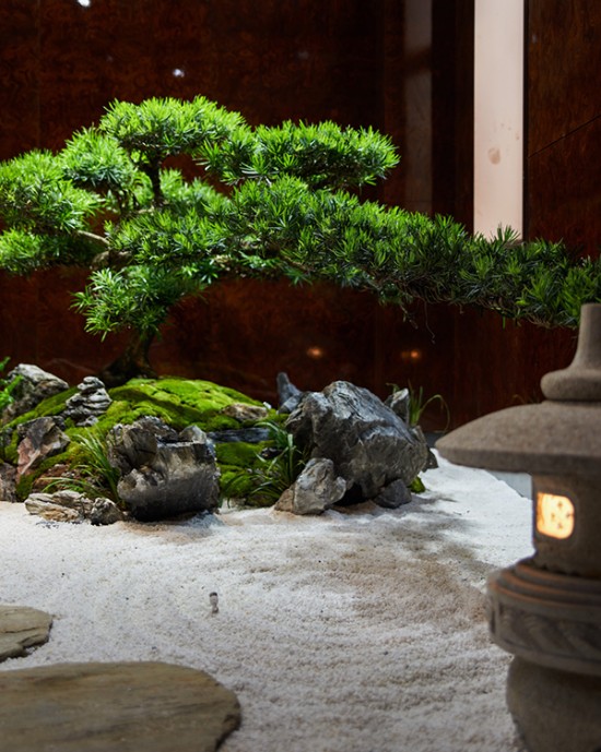 設(shè)計之初,印象空間就設(shè)想把自然景觀融入營銷中心,與周邊環(huán)境相呼應,拉近人與空間的距離。在現(xiàn)場施工條件有限的前提下,綜合各種因素的考量,最終以景觀軟裝來呈現(xiàn)。一體成型的景觀軟裝擁有成熟的模擬系統(tǒng),可控的土壤溫度、澆灌循環(huán)等維持著生態(tài)蓬勃,無論是呈現(xiàn)效果,還是后期維護,都無可挑剔。