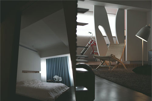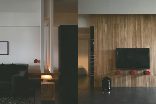 以溫潤木質和黑色酷勁的視聽設備形成對比,亦強化出火紅色音響的狂放熱情。