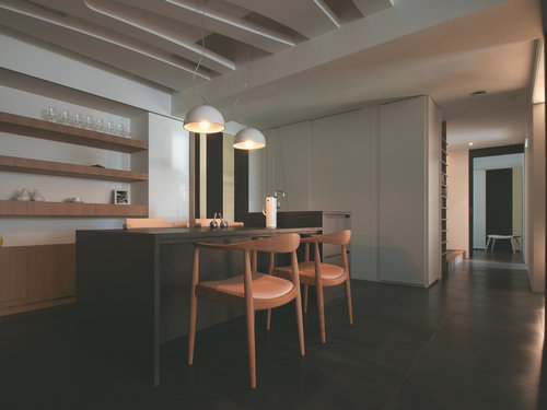 入門起無差別的地坪配置,以一張地毯區(qū)別客廳段落亦軟化空間調性。
