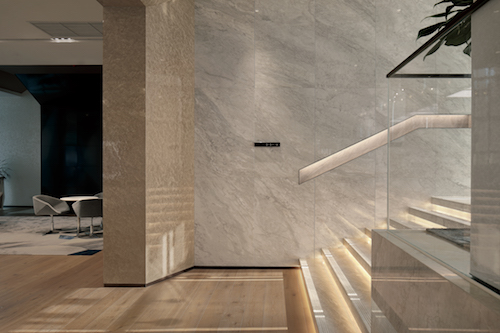 淺色的大理石色調(diào)使整體空間具有雅致、簡(jiǎn)潔、干凈的氛圍。在連接一層和二層空間的踏步式樓梯,大理石墻面模擬扶手扶梯的形狀,設(shè)計(jì)了隱藏式的燈帶,臺(tái)階下方同樣使用了隱藏?zé)魩В缺WC了客人上下樓的安全,又增添了空間的藝術(shù)氛圍。