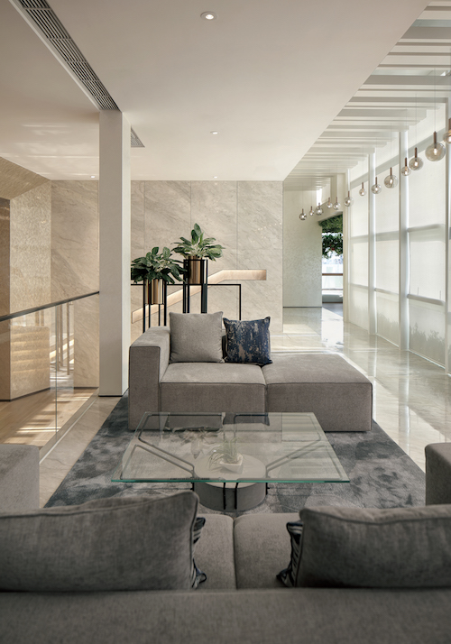 一樓洽談區(qū)告別常規(guī)風(fēng)格,利用柱位作為設(shè)計(jì)的延伸,大理石隔斷墻劃分出相對(duì)獨(dú)立的洽談空間,在尊重客戶(hù)隱私的同時(shí),避免洽談氛圍的尷尬。全景式的玻璃墻具有很強(qiáng)的透光功能,讓洽談?wù)咴诹奶鞎r(shí)擁有開(kāi)闊的視野和愉悅的心情。于玻璃墻的邊緣鋪設(shè)一排鵝卵石,將大自然的事物引入室內(nèi),起到和室外美景的完美銜接。