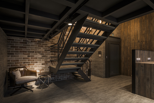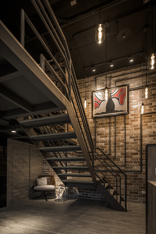 門片以鐵門仿制銹鐵的斑駁感再以鉚釘裝飾,家具部分以原木色為基底,結(jié)合黑色、咖啡色、白色…等色,結(jié)合工藝手法使家具襯托出空間的強烈質(zhì)感;部分以材質(zhì)處理呈現(xiàn)復(fù)古的斑駁質(zhì)感;部分延伸樓梯扶手的管線重新組構(gòu)等展現(xiàn)LOFT風(fēng)格的粗獷感。