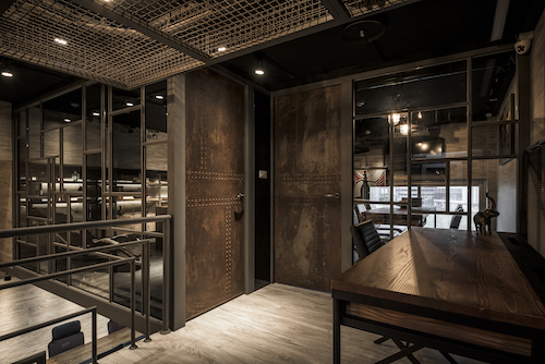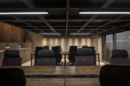 挑高部分以不規(guī)分割的造型金屬框、交錯分布的清玻、黑玻、管線延伸的設(shè)計手法延伸視覺高度及空間寬闊感。藉由自然光線、柔黃色調(diào)的燈光解決一致性色調(diào)帶來的冰冷感,并將燈具在不同區(qū)域依空間屬性有所不同,挑高空間以垂吊型式的裸露燈泡外罩玻璃罩并藉由玻璃隔間的反射特性呈現(xiàn)公共區(qū)域的大器與沉穩(wěn)質(zhì)感,將空間質(zhì)感細細體現(xiàn)。