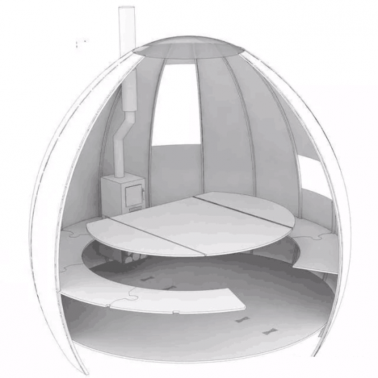 “世外桃源”艙室在材料上的這一仿生的特點與它的工業(yè)設計形成了鮮明的對比。通過抬高臺階,整個艙室可以被任意旋轉至理想的朝向。