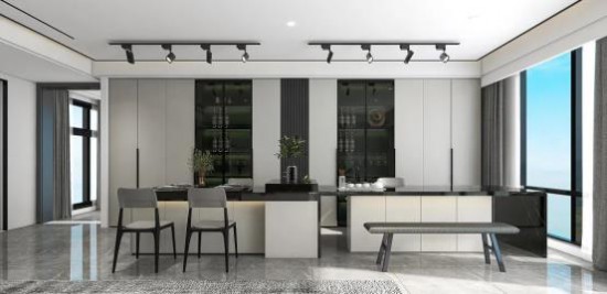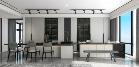 協(xié)調(diào)整體空間比例,客餐廳一體打造通透開闊的視覺效果。選用無色系的黑白灰鋪染空間氛圍,吊燈處零星分布的射燈點綴,多一份溫柔質(zhì)感。