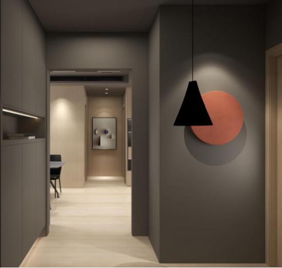 推開家門,深淺有致的灰度空間靜雅純粹,別有一番“留白”式藝術韻味,橘色墻飾與光呼應,散發(fā)浪漫氣息。隱藏式鞋柜設計,整潔大氣,節(jié)省空間也便捷生活。