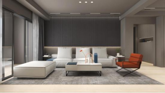 深灰色格柵背景墻內設燈光,提升整體空間的藝術感與精致度,CBD家居·黑金 | HZ129沙發(fā),米白色舒緩柔和,渲染出愜意而舒適的意境,簡雅方正的形制,整齊有序的圍合布局,凸顯空間張力,自在倚坐,得靜心閑適。