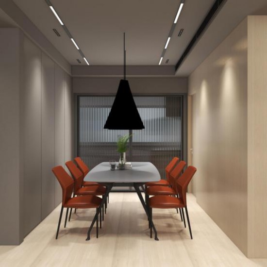 餐廳頂部懸掛吊燈,簡潔卻充滿設計感,不設地毯,保留原木的整體觀感,營造自然溫馨的用餐氛圍。