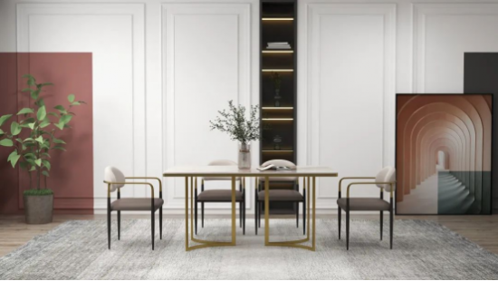 融合金色材質(zhì)的家具也能呈現(xiàn)出高級的金屬質(zhì)感,CBD·奢愛家居 | XS001餐臺,潘多拉巖板桌面色澤溫潤,觸感也足夠平滑。